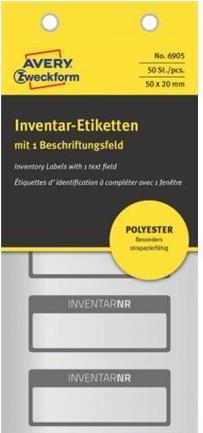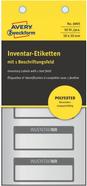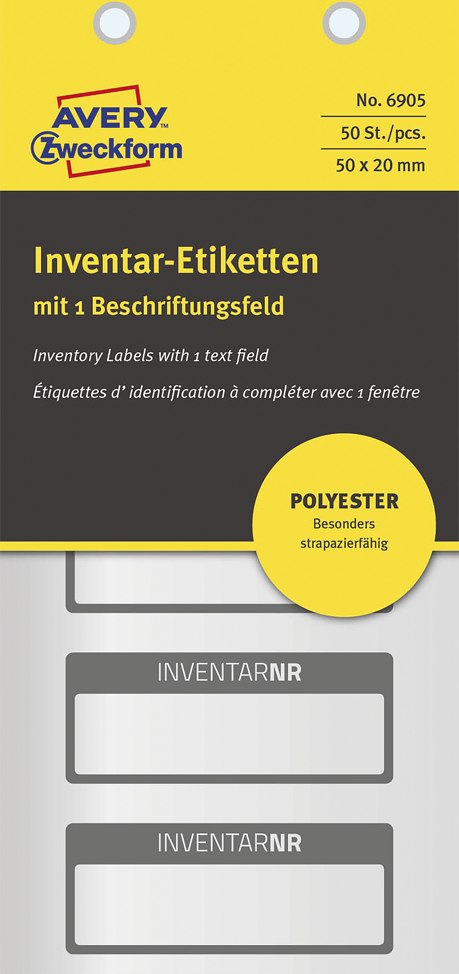Die Inventar-Etiketten 6905 von Avery Zweckform haben einen kratzbeständigen und wetterfesten Aufdruck.