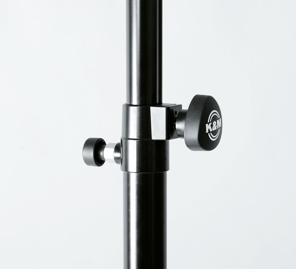 König & Meyer Stahl Distanzrohr Ring LockPatentierter Spreizdorn \"\"Ring Lock\"\"Resonanzarme Verbindung durch Spreizbacken aus KunststoffUnerschütterlich! Diese hochwertige, höhenverstellbare Distanzstange ist der Garant für die sichere, wackelfreie und geräuscharme Verbindung von Satellitensystemen. Die Höhenverstellung erfolgt komfortabel mittels Rastbolzen und Sicherungsschraube. Beidseitig integriert ist der einzigartige, patentierte Spreizdorn, der sich für den festen, spielfreien und fixierbaren Sitz des Subwoofers und der Satellitenbox verantwortlich zeigt. Die Spreizbacken aus Kunststoff sorgen zudem für eine resonanzarme Verbindung zwischen Box und Rohr. Die Fixierung der Box ist denkbar einfach und erfolgt über einen handlichen Spannring, der einfach auf - und zu gedreht wird. Ausstattung: Material: Stahl1-fach ausziehbarRastbolzen und SicherungsschraubeFarbe Schwarz.Technische Daten: Gewicht: 2.9 kgHöhe (min.): 98 cmProduktabmessung, Höhe: 147 cmProduktabmessung, Ø: 35 - 37 cm