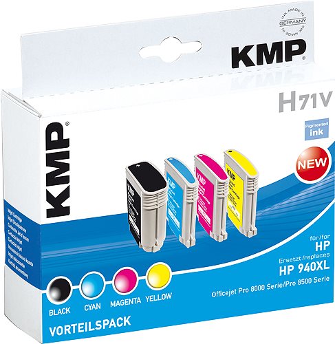 | Produktbeschreibung | KMP MULTIPACK H71V - 4er-Pack - Schwarz, Gelb, Cyan, Magenta - kompatibel - Tintenpatrone (Alternative zu: HP 940XL, HP C4906AE, HP C4907AE, HP C4908AE, HP C4909AE) |