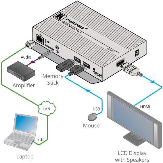 KDS-MP4 ist ein hochqualitatives LAN-basiertes Abspielgerät für Digital Signage. Das Gerät erhält die Daten entweder über LAN oder von einem externen USB-Memorystick von der Media Manager Software eines PC, lädt diese in seinen internen Speicher und gibt sie dann über den HDMI-Ausgang mit einer Auflösung bis 4K UHD wieder.
