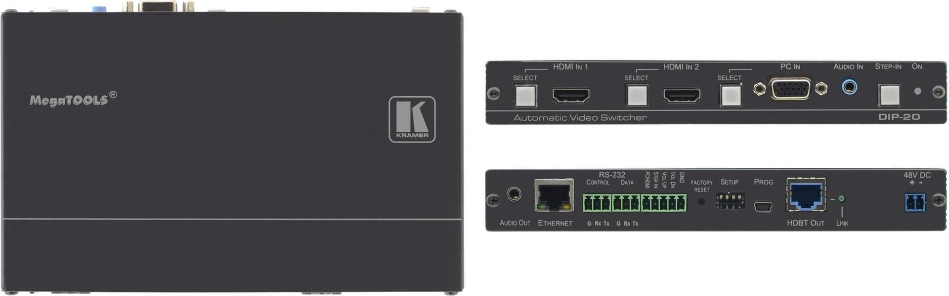 | Produktbeschreibung | Kramer MegaTOOLS DIP-20 HDBaseT transmitter / step-in commander |