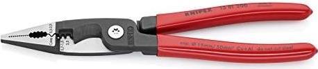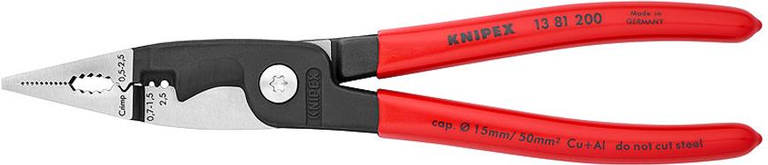 - Multifunktionszange für die Elektroinstallation; zum Greifen von Flach- und Rundmaterial, Biegen, Entgraten, Kabelschneiden, Abisolieren und Crimpen von Aderendhülsen