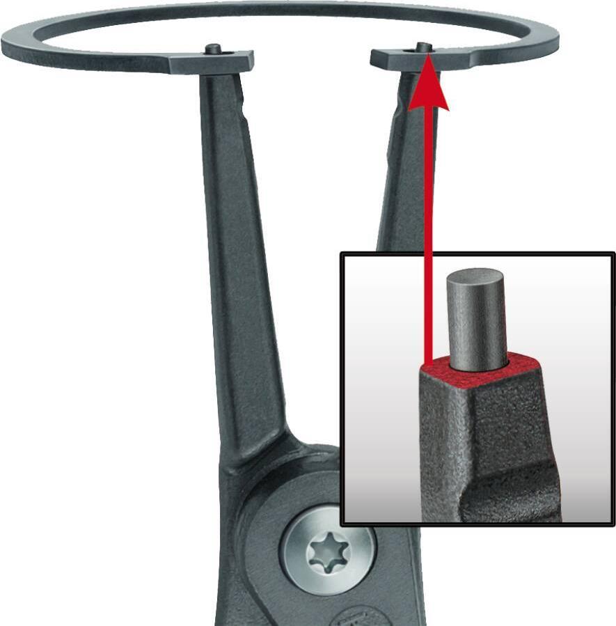 Zur Montage von Sicherungsringen auf Wellen. Im Gelenk liegende Öffnungsfeder, geschützt und unverlierbar.