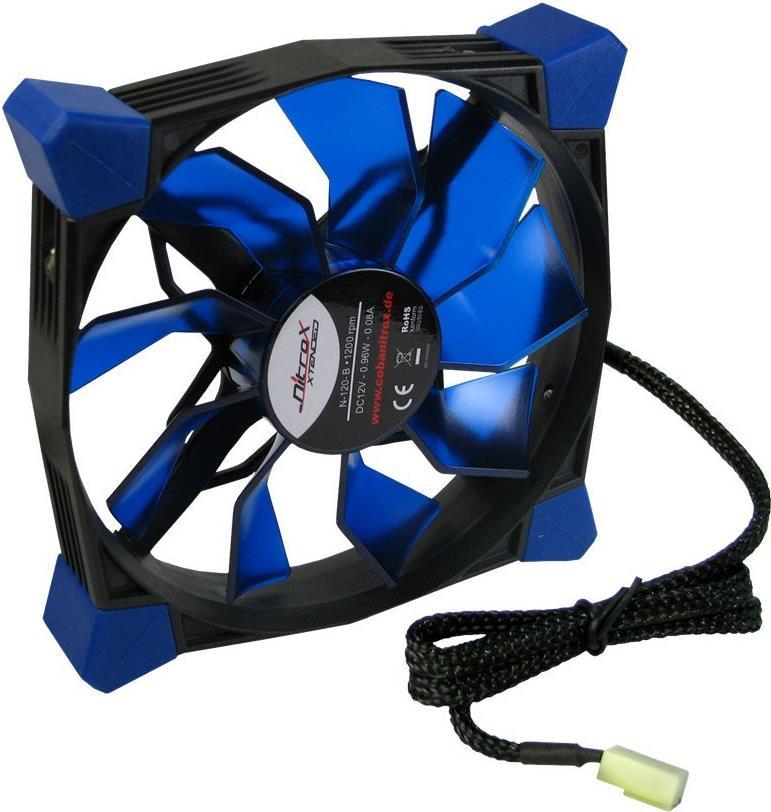 CobaNitrox bekannt durch hervorragende Netzteile, erweitert mit der Extended-Serie sein Sortiment um ausgewählte Produkte.Die Lüfter-Serie N-120 ist ein solches Produkt welches mit Eigenschaften überrascht die von vergleichbaren Lüftern nicht geboten werden.So unterbinden die farbig abgesetzten, aus Silikon-Gel gefertigten, Befestigungsecken des Lüfters zuverlässig die direkte Übertragung der Lüftergeräusche auf das Gehäuse. Integrierte Schnellbefestigungen machen zudem den Einsatz von Schrauben und Werkzeug überflüssig.Last but not least bilden auch die farbliche Abstimmung der \"Dämpfer\" und Lüfterblätter, sowie die Beleuchtung des Lüfters in der Farbe der Lüfterblätter einen optischen Anreiz für den Erwerb eines N-120.