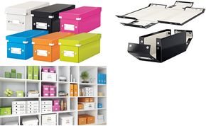Aufbewahrungsbox für CDs. Leichtes Aufbauen dank praktischer Druckknöpfe und ebenso schnelles Zusammenklappen zum platzsparenden Verstauen. Etikettenhalter zur Kennzeichnung. Hergestellt aus stabilem, hochwertigem recyceltem Karton. Laminierte Oberfläche für einen besseren und dauerhaften Schutz. Modernes und zeitgemäßes Design für Zuhause oder fürs Büro. Volumen 5 Liter.