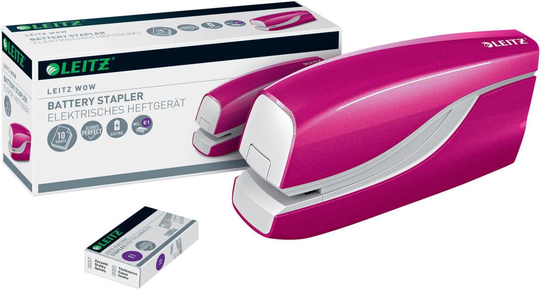 Ideal für häufiges Heften. Zum besseren Schutz muss das Heftgerät nicht berührt werden, so ist hygienisches Heften durch kontaktlosen Gebrauch möglich. Die auffälligen WOW Farben sind ein echtes Highlight auf jedem Schreibtisch. Dank Batteriebetrieb mobil einsetzbar. Heften ohne Klammerstau mit den e1 Heftklammern.