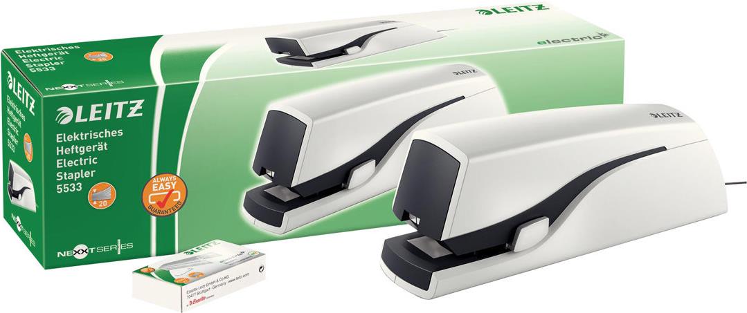 LEITZ Großes elektrisches Heftgerät Nexxt, perlweiß Heftleistung: 20 Blatt, verstellbare Einlegetiefe: 10-20 mm (5533-10-01)