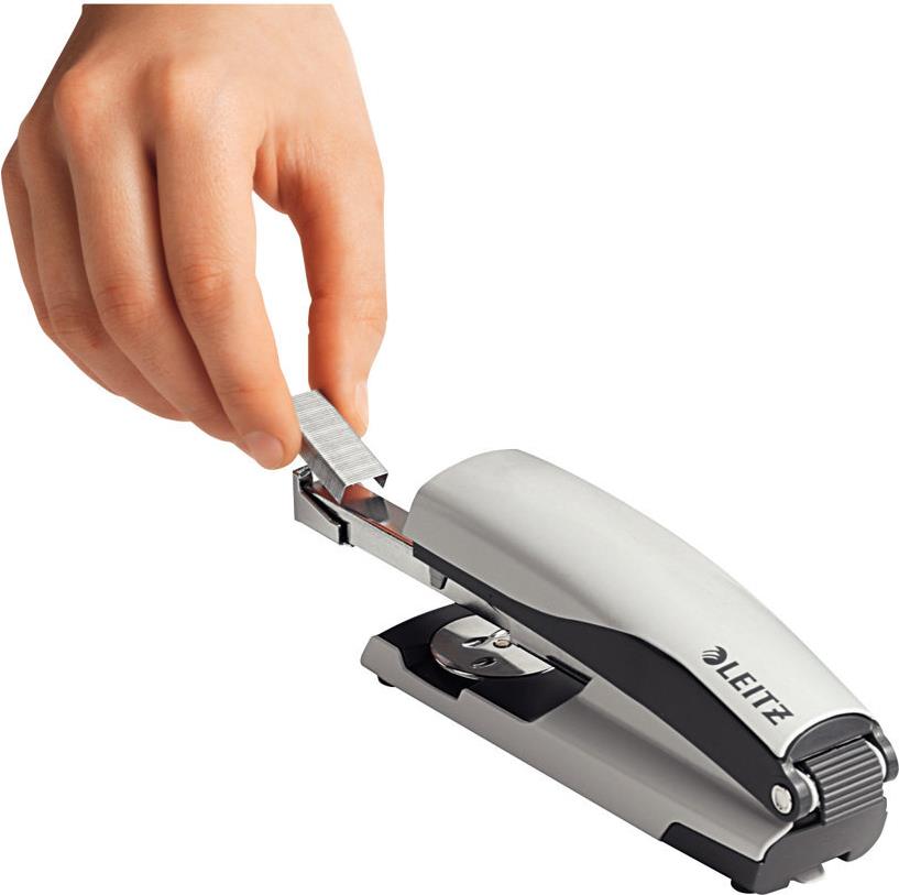 Robustes Metallheftgerät für den täglichen Einsatz. Stabil und zuverlässig. Die patentierte Direct Impact Technology und Leitz Power Performance Heftklammern P3 (24/6, 26/6) und P4 (24/8, 26/8) garantieren stets eine perfekte Heftung.
