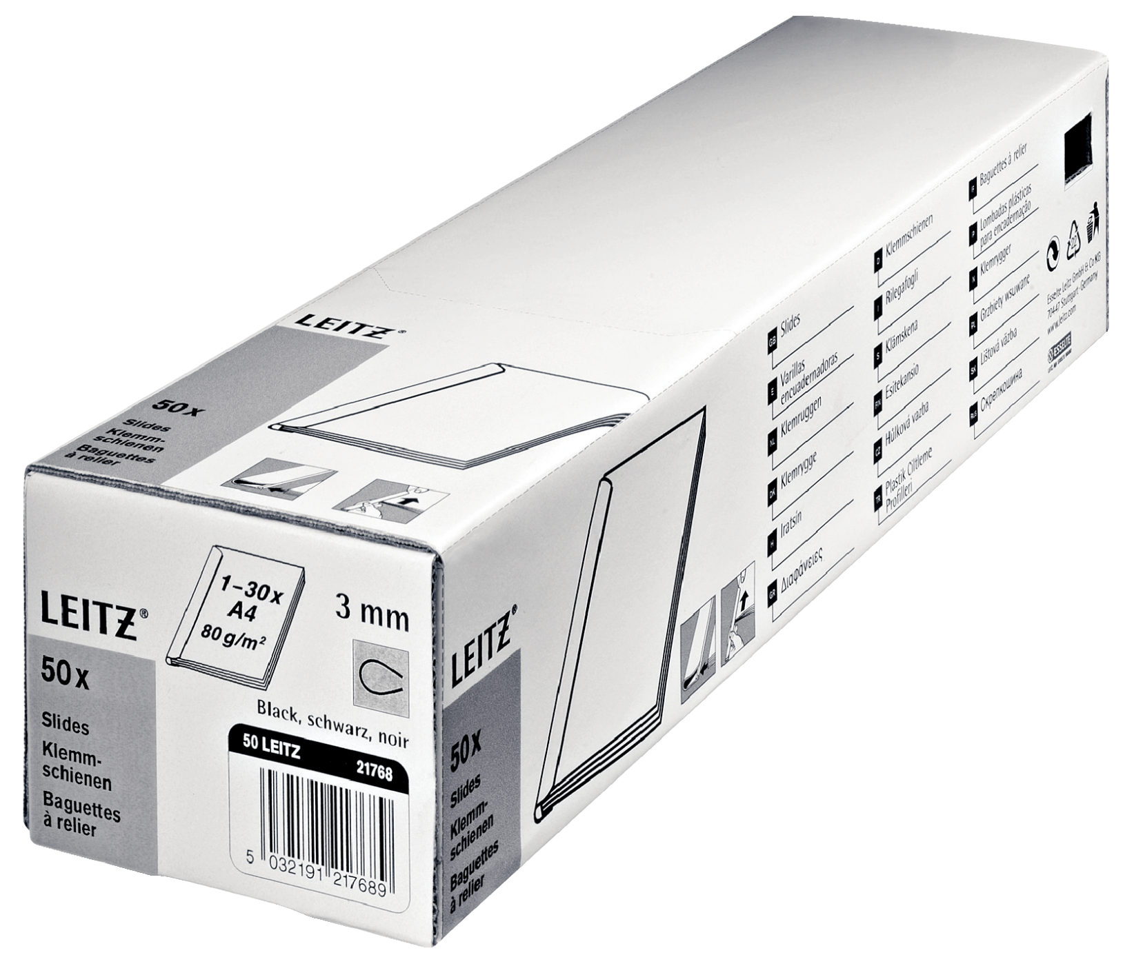 Klemmschienen sind ein vielseitiges Bindesystem für ungelochte Unterlagen ohne Verwendung eines Gerätes. Der Papierstapel wird in die Kunststoffklemmschiene eingeschoben - das ist alles! Ideal für schnelles und einfaches Binden. Die Klemmschienen können mit Deckblättern für Bindesysteme kombiniert werden.