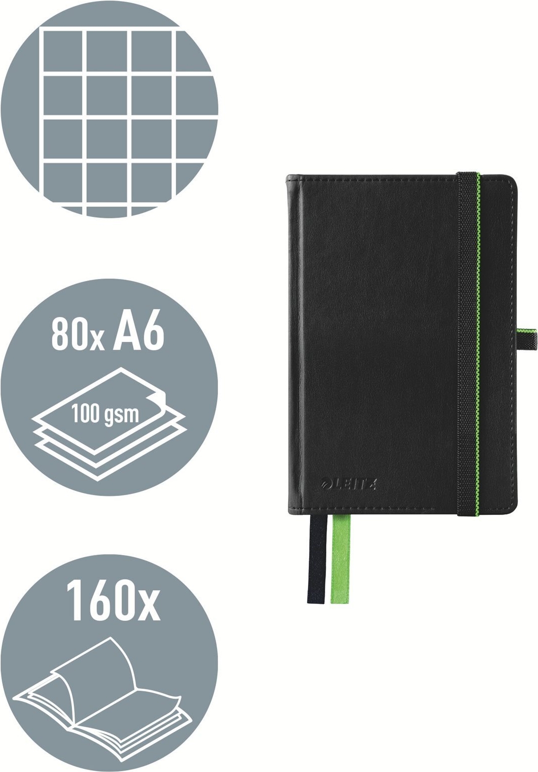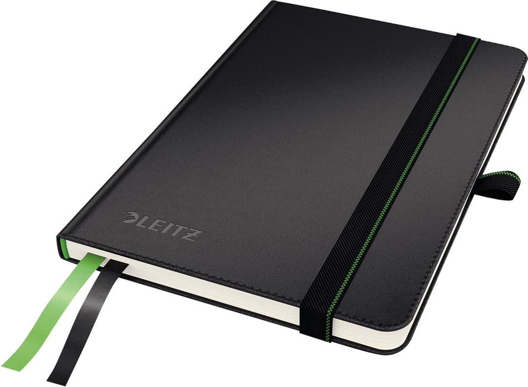 LEITZ Notizbuch Complete, DIN A6, kariert, schwarz 80 Blatt, 96 g/qm, elfenbein Papier, Lederoptik, Touch-and- (4479-00-95)