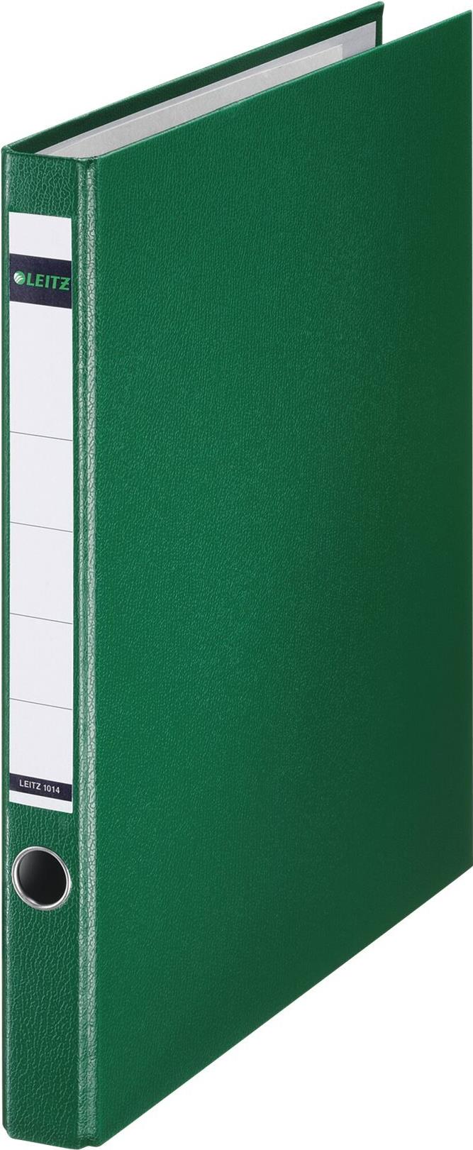 LEITZ Plastik-Ringordner, DIN A4, grün, 2 D-Ring-Mechanik Rückenbreite: 35 mm, Einband aus Pappe, innen mit PP-Folie kaschiert, mit Blattniederhalter, ohne Schlitze, Griffloch, Deckblatt und aufgeklebtem Rückenschild (1014-00-55)