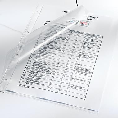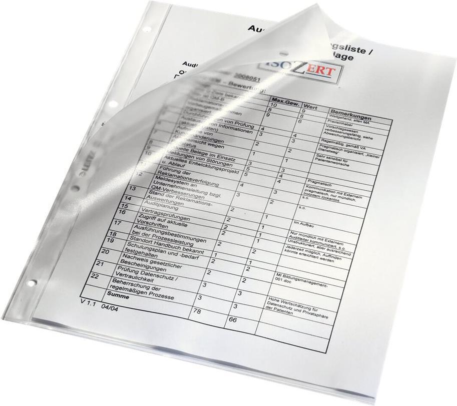 LEITZ Prospekthülle, A4, PP, genarbt, 0,12 mm, Lochseite offen, oben offen, dokumentenecht, mit Einreißschutz, mit durchgehend gelochtem Oberteil, Greifausschnitt links oben, Lochung: 80-80-80 mm Inhalt: 100 Stück (4784-00-03)