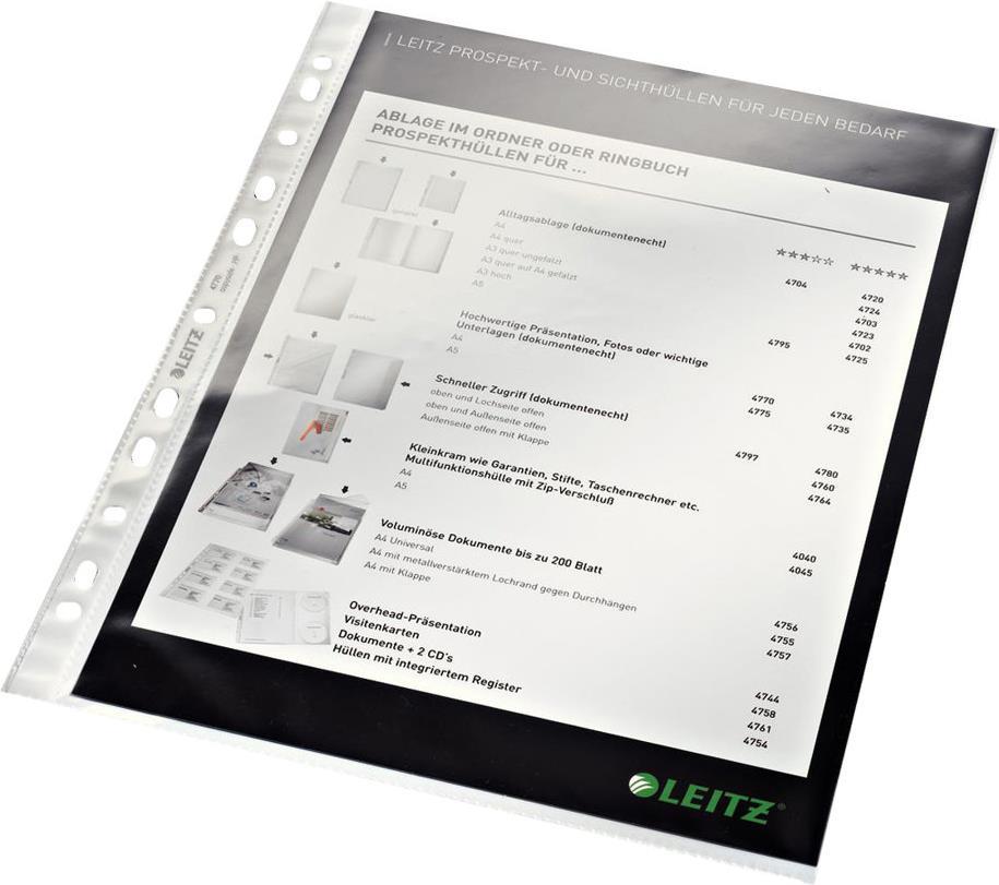 LEITZ Prospekthülle Standard, A4, PP, glasklar, 0,08 mm oben offen, dokumentenecht, Lochung: Eurolochung (4770-00-02)
