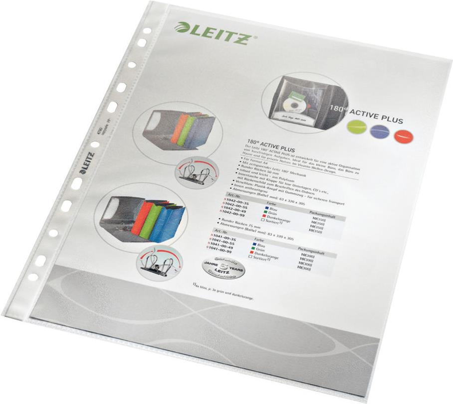 Prospekthüllen mit einer klaren, matten Oberfläche, ideal für den täglichen Gebrauch zu Hause, im Büro oder in der Schule. Der verstärkte Streifen mit 11 Löchern ermöglicht die bequeme Aufbewahrung von Dokumenten in Ordnern und Ringbüchern und schützt sie vor Feuchtigkeit, Staub und Schmutz. Dank der Öffnung oben und an der linken Seite ist der Zugriff auf die Unterlagen sehr einfach und erspart das zusätzliche Öffnen der Ordner-Heftmechanik. Das dokumentenechte und säurefreie Material gewährleistet den Schutz der Dokumente. Hergestellt aus PP-Kunststoff (Polypropylen) mit 30% Pre-Consumer-Anteil, 100% recycelbar.