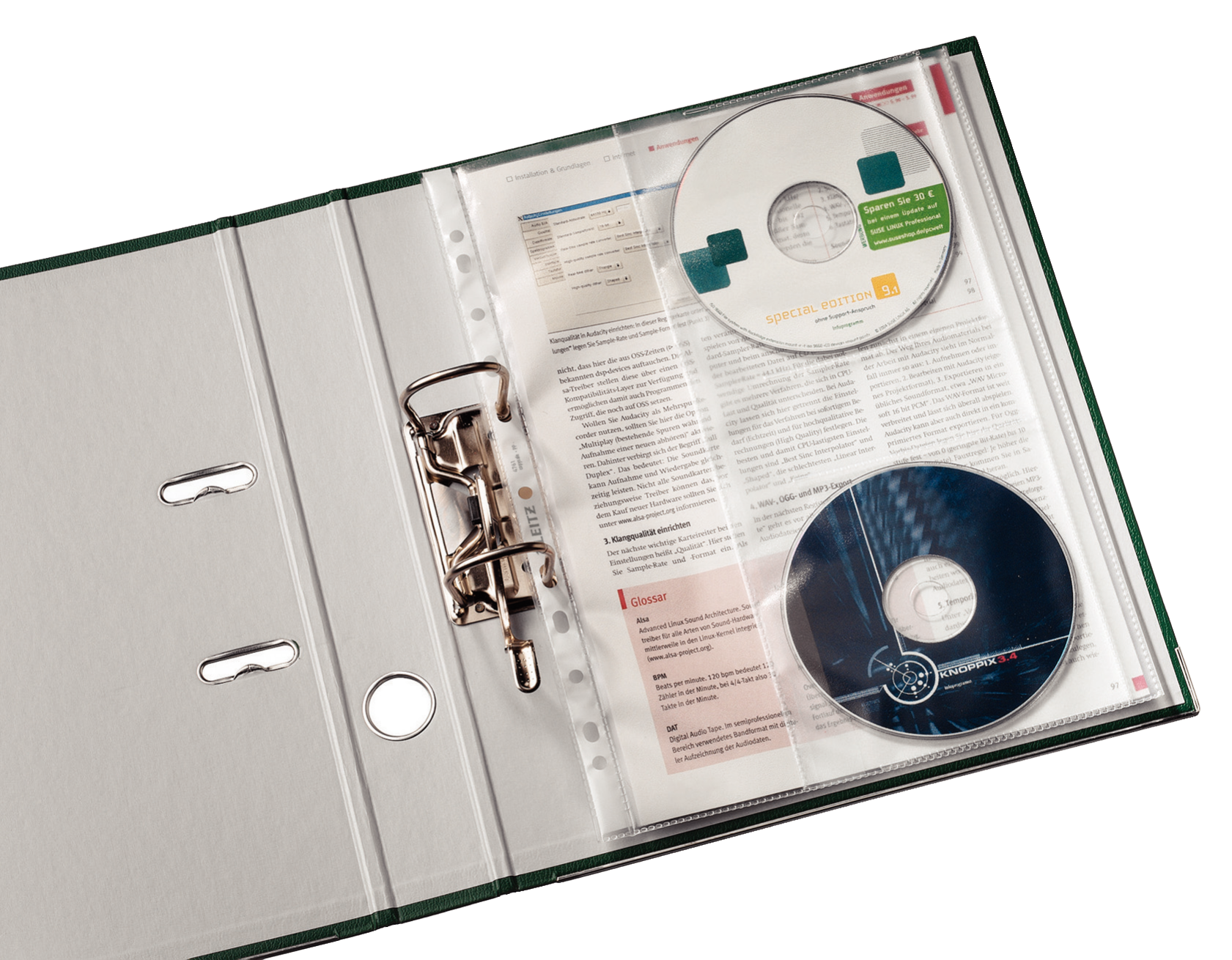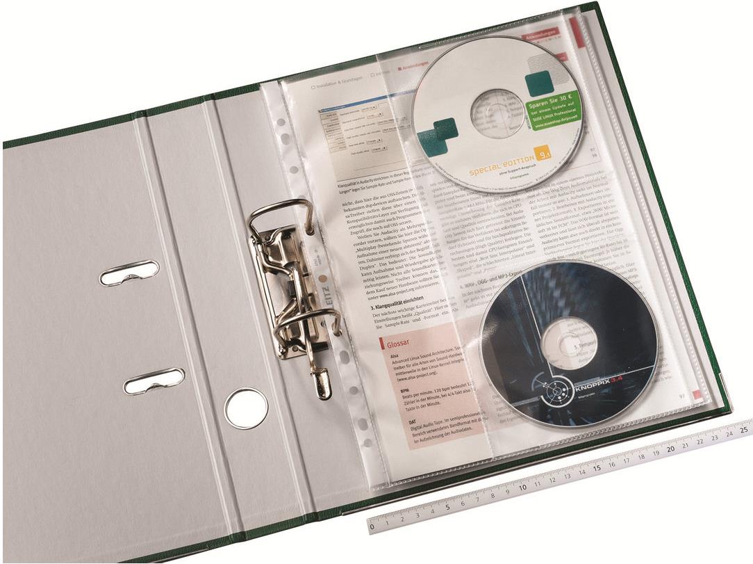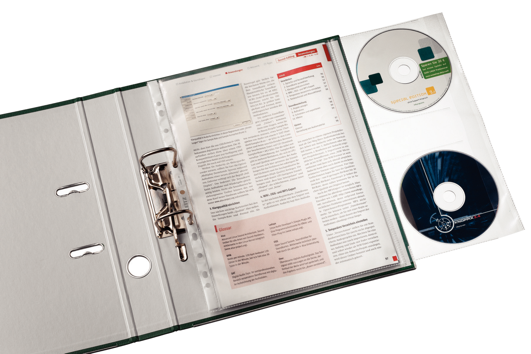 Hochwertige Prospekthüllen für CDs und Dokumente mit einer klaren, matten Oberfläche, ideal für den Gebrauch zu Hause, im Büro oder in der Schule. Die 11-Loch-Universallochung ermöglicht die bequeme Ablage der Hülle in Ordnern und Ringbüchern. Lässt sich oben öffnen, um den Zugriff auf Dokumente zu erleichtern, ohne die Ordnermechanik zu öffnen, und hat eine Klappe für zwei CDs. Dokumentenechtes und säurefreies Material gewährleistet den langfristigen Schutz der Dokumente. Hergestellt aus PP-Kunststoff (Polypropylen) mit 30% Pre-Consumer-Anteil und zu 100% recycelbar.