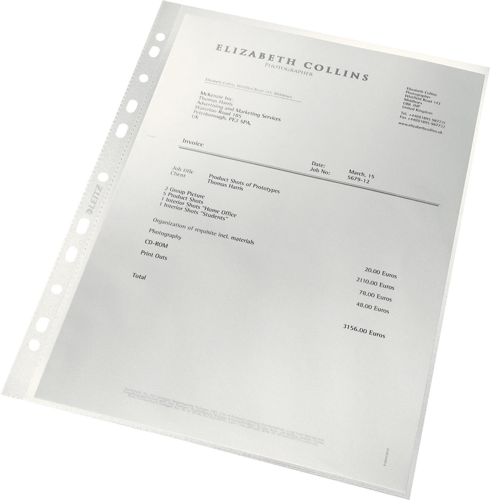 LEITZ Prospekthülle re:cycle, A4, PP-Restmaterial, 0,09 mm genarbt, oben offen, dokumentenecht, Lochung: Eurolochung 100% recycelbar, PP-Folie aus Restmaterialien der Industrie- proktion, Verstärkungsstreifen Inhalt: 100 ...