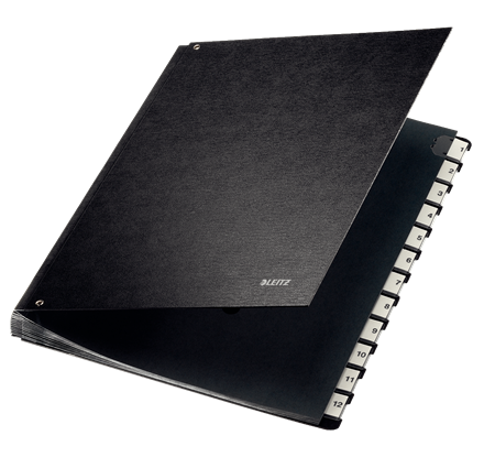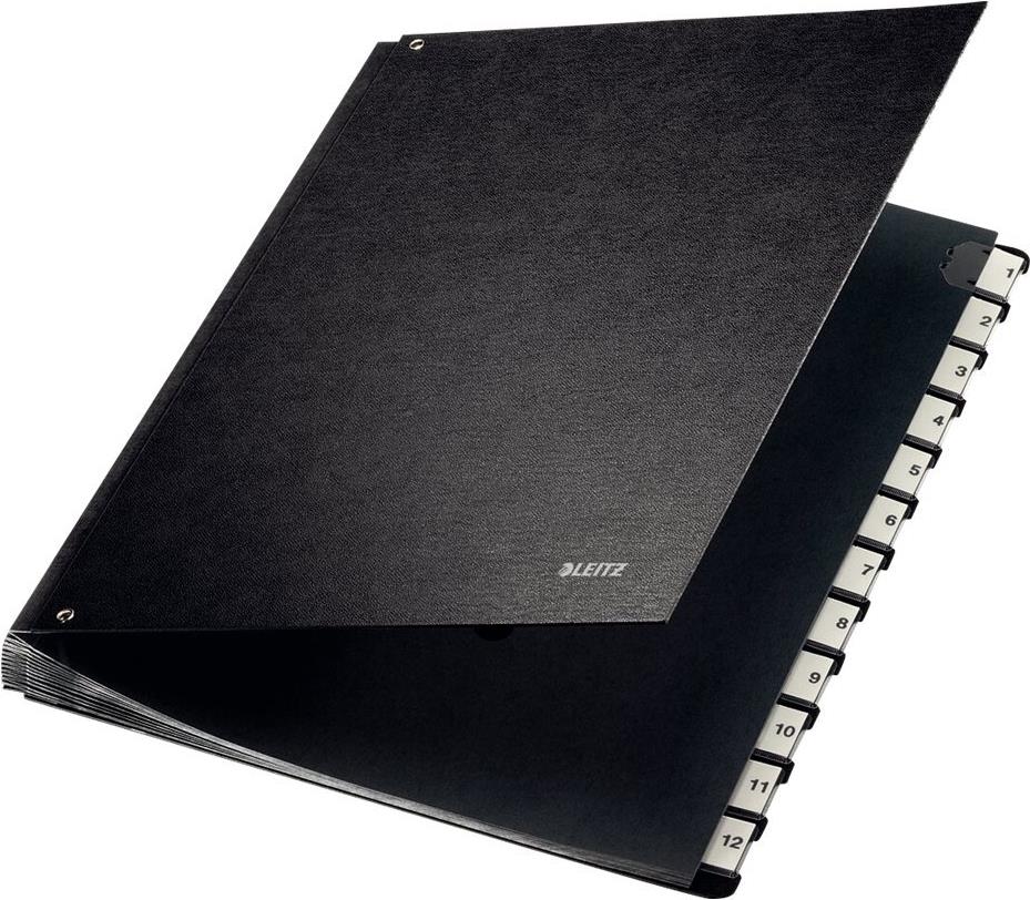 LEITZ Pultordner, A4, 1-12, 12 Fächer, Hartpappe, schwarz Fächerblock aus reißfestem Karton, Einband aus Hartpappe, mit 6 Sichtlöchern, Plastik-Taben, dehnbarer Rücken, Maße: (B)270 x (H)345 mm (5812-00-95)