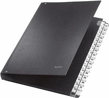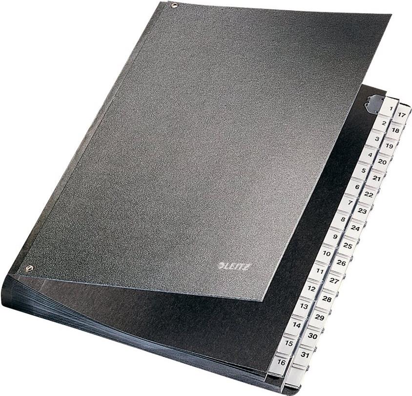 LEITZ Pultordner, A4, 1-31, 32 Fächer, Kunststoff, schwarz Fächerblock aus reißfestem Karton, Einband aus Graupappe (5931-00-95)