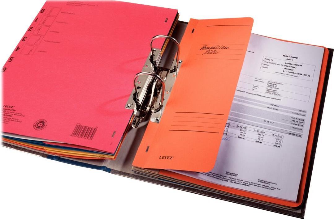 Farbiger Schlitzhefter mit Mechanik zur Ablage von gelochten Unterlagen. Spezielle Schlitze ermöglichen ein schnelles Einhaken im Ordner, ohne dass die Mechanik geöffnet werden muss.