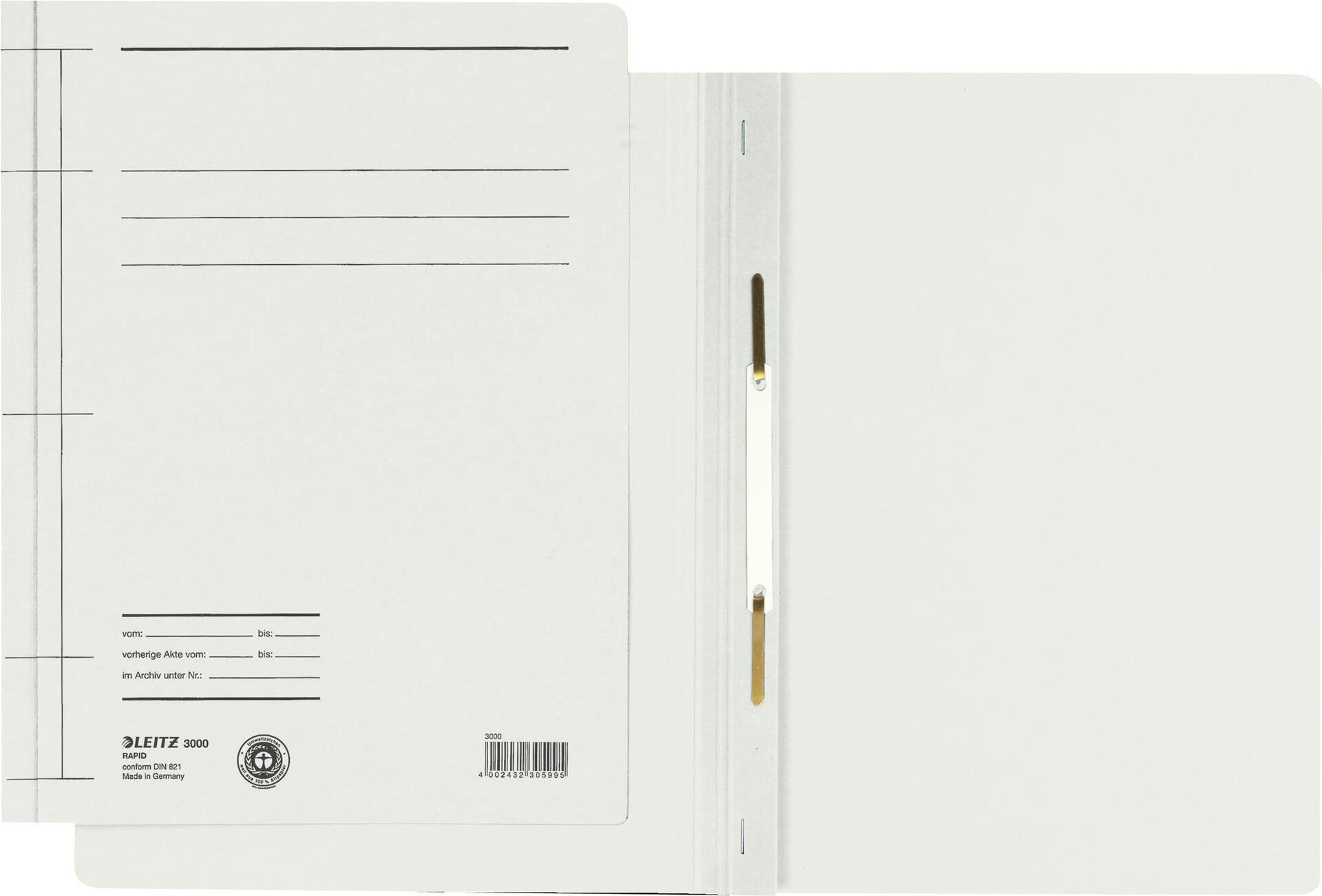 LEITZ Schnellhefter Rapid, DIN A4, Manilakarton, weiß 250 g/qm, Fassungsvermögen: 250 Blatt, Heftmechanik für Standard-Lochung 80 mm, mit Beschriftungslinien, für kaufmännische Heftung und Amtsheftung verwendbar, Maße: (B)240 x (H)318 mm gepackt zu 25 Stück (3000-00-01)