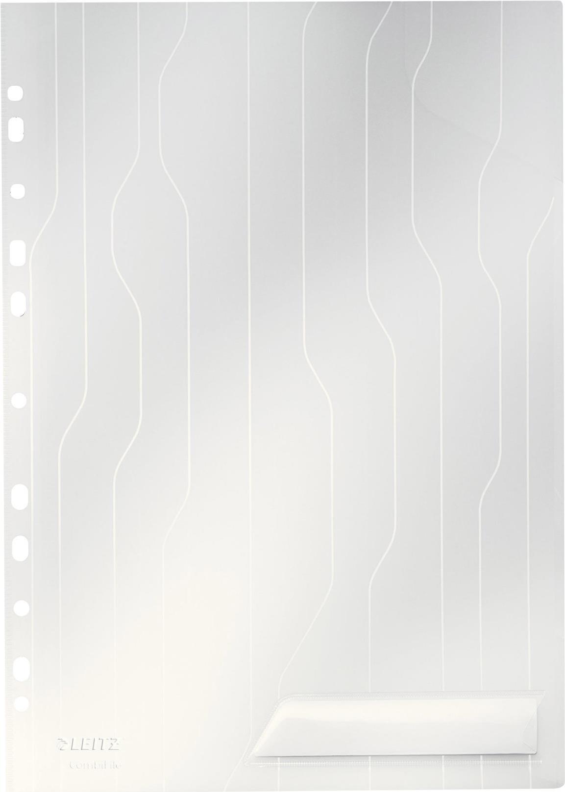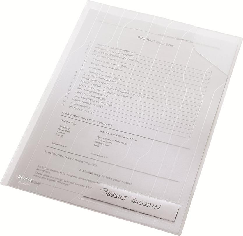 Einklappbarer Lochrand macht die Hülle flexibel für Ablage im Ordner, zum Stapeln auf dem Schreibtisch oder unterwegs. Rechte Seite zu 1/6 geschlossen, damit nichts herausfällt. Blickschutz für vertrauliche Unterlagen. Mit Beschriftungsstreifen für schnelles Wiederfinden.