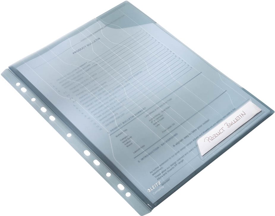 Einklappbarer Lochrand macht die Hülle flexibel für Ablage im Ordner, zum Stapeln auf dem Schreibtisch oder unterwegs. Rechte Seite zu 1/6 geschlossen, damit nichts herausfällt. Blickschutz für vertrauliche Unterlagen. Mit Beschriftungsstreifen für schnelles Wiederfinden.