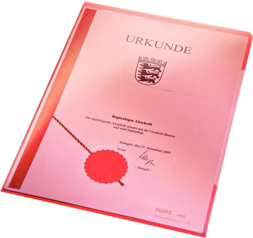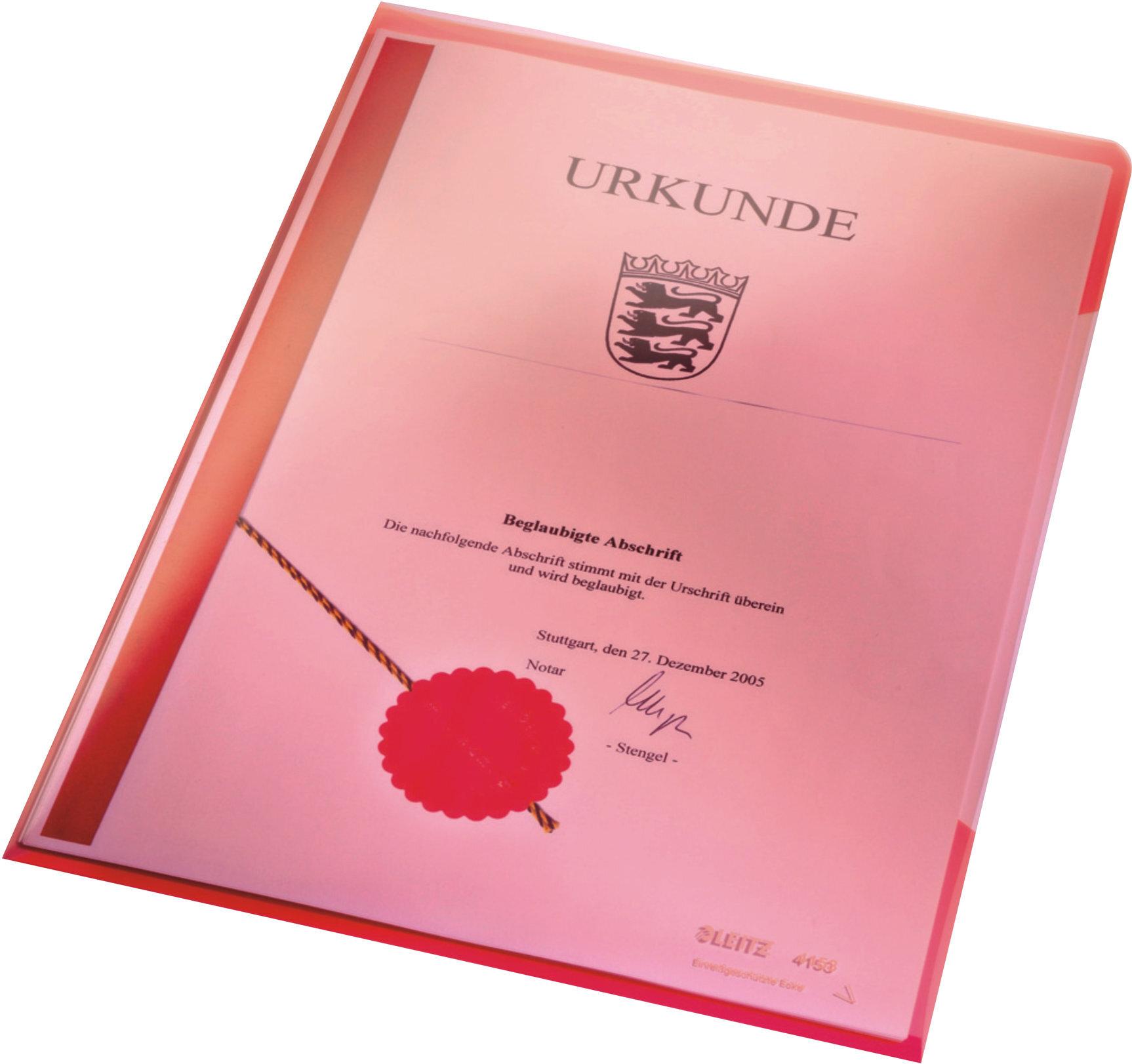 LEITZ Sichthülle Super Premium, A4, PVC, rot, 0,15 mm oben und seitlich offen, dokumentenecht, Hartfolie (4153-00-25)