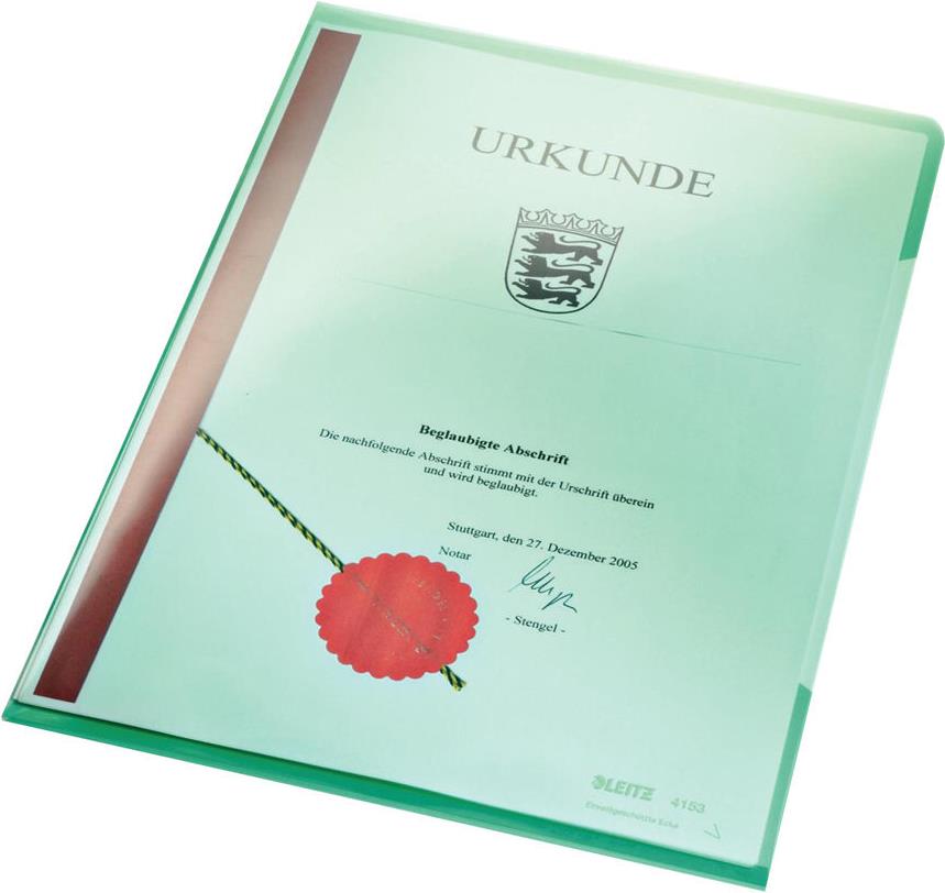 LEITZ Sichthülle Super Premium, A4, PVC, grün, 0,15 mm oben und seitlich offen, dokumentenecht, Hartfolie (4153-00-55)