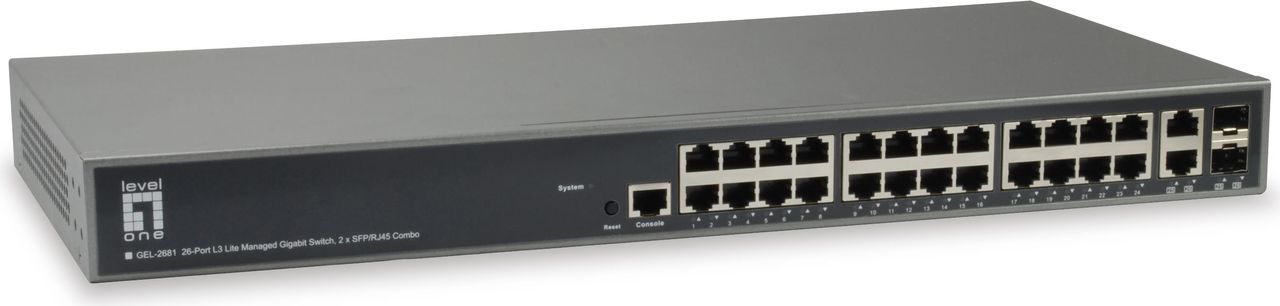 Der LevelOne GEL-2681 L3 Lite Managed Switch ist ein Ethernet-Switch der nächsten Generation, der eine vollständige Palette von Layer2-Funktionen, erweiterte Layer3-Funktionen wie Static Route und verbesserte Benutzerfreundlichkeit sowie niedrigere Gesamtbetriebskosten in Unternehmensnetzwerken über Glasfaser- oder Kupferverbindungen bietet. Der GEL-2681 bietet darüber hinaus 24 (10M/100M/1000Mbps) RJ45 Ports, 2 Combo Gigabit RJ45/SFP-Ports und einen RJ45-Konsolenport. Außerdem bietet der GEL-2681 eine hohe HW-Leistung und Umgebungsflexibilität für KMUs und Unternehmen und ist ideal für eine einfache Verwaltung und ein intuitives Benutzererlebnis. Das Embedded Device Management System wurde entwickelt, um ein Netzwerk von IP-Telefonen, IP-Kameras oder Wifi-APs für jede Größenordnung von Unternehmensanwendungen zu verwalten und zu überwachen und die Bereitstellung deutlich zu vereinfachen. - 24 Gigabit-Anschlüsse und 2 Gigabit-RJ45/SFP-Kombianschlüsse - QoS-Steuerung für Verkehrspriorisierung und Bandbreitenmanagement - DHCP-Client/Server - Unterstützt IPv4/IPv6 - Minimiert den Stromverbrauch durch moderne Energieeffizienz (IEEE-802.3az) - IEEE 802.3ad LACP für automatische Port-Aggregation - Unterstützt VLAN (Port-/Protocol-/Tag-basiertes, Private, Q-in-Q) und GVRP - IEEE 802.1d/w/s Spanning Tree Protocol (STP) und Port Mirroring - IP Multicast Filtering mittels IGMP Snooping V1/ V2/ V3