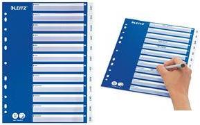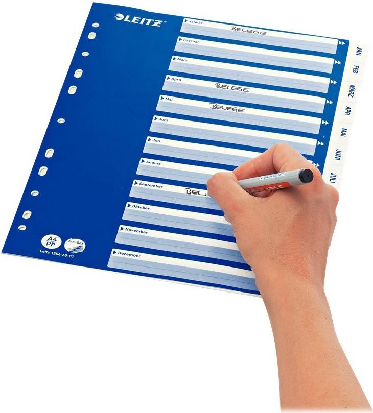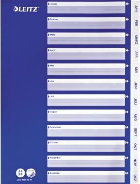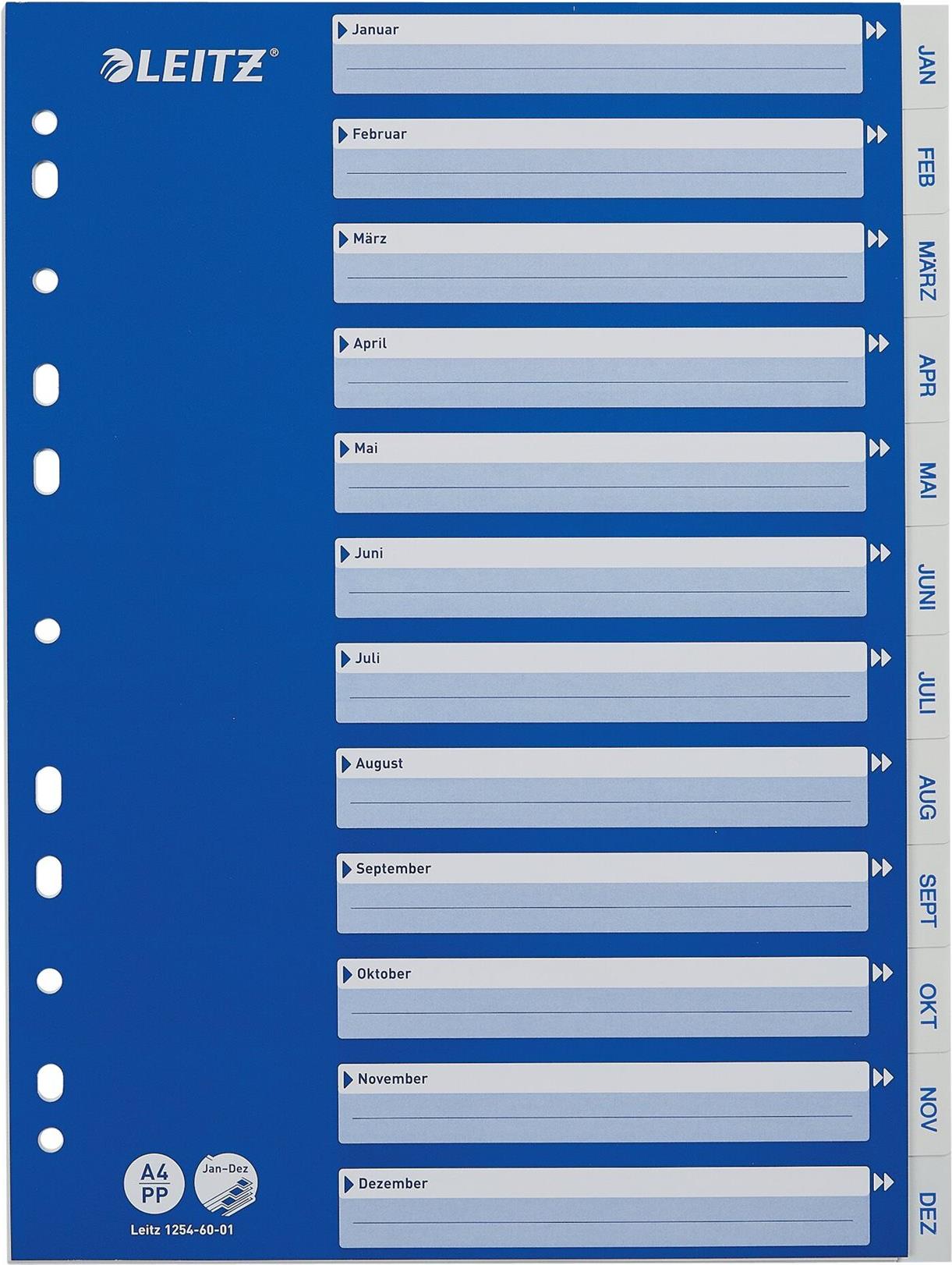 LEITZ Kunststoff-Register, Monate, A4, Jan.-Dez., PP, weiß 12-teilig, Januar - Dezember, 0,12 mm, mit blauem beschriftbarem Deckblatt aus Hartpappe (250 g/qm), bedruckte Taben, Standard-Ausführung, Eurolochung, Maße: (B)225 x (H)297 mm (1254-60-01)