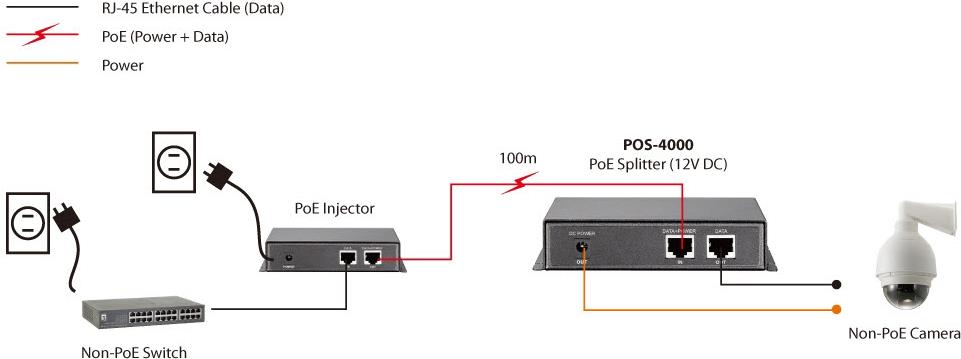POS-4000 kann auch mit LevelOnes High-Power-PoE-Injektor POI-4000 zusammenarbeiten. Dieser kann die Ethernet-Konnektivität um zusätzliche 100 Meter für Hochleistungs-PoE-Geräte, wie IP-Netzwerkkameras, drahtlose Zugangspunkte, VoIP-Telefone oder andere Geräte, die eine Leistung von mehr als 15,4 W benötigen, erweitern.