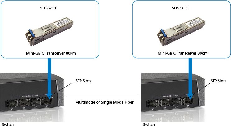 Der LevelOne SFP-3711 ist ein leistungsstarker und kostengünstiger Single-Mode SFP-Transceiver. Für die Verwendung mit Gigabit-Ethernet bietet er bis zu 1.25Gbps bidirektionale Datenübertragungsrate auf einem eSingle Duplex-Glasfaserkern. Bei Einsatz mit 9 Mikrometer Glasfaserkabel kann die Sendeleistung erhöht und eine Distanz von bis zu 120km erreicht werden. Der SFP-3711 Transceiver arbeitet mit einer Wellenlänge von 1550nm und einer DFB-Laserdioden-Lichtquelle und verfügt über einen LC-Anschluss.