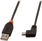 USB 2.0 Kabel (abwärtskompatibel) mit Typ A Stecker an Typ Mini-B 90° Stecker im LINDY Design schwarz mit rotem Knickschutz, Längen von 0,5m bis 2m.