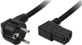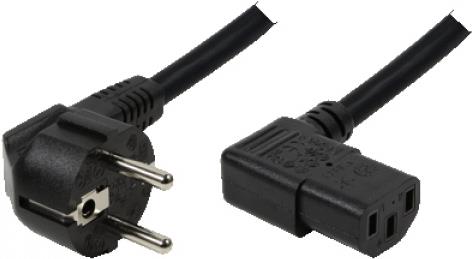 Netzkabel von LogiLink Schuko Stecker auf IEC-C13 Buchse. Der Netzstecker sowie der Kaltgerätestecker sind gewinkelt. Das Kabel ist schwarz, die Länge beträgt 2,00 Meter.