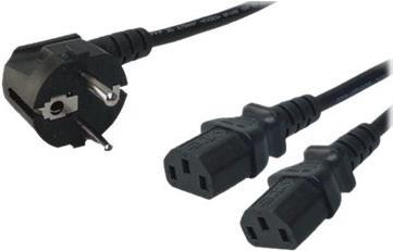 Y-Stromversorgungskabel zum Anschluss des PCs und Monitor an einem 230 Volt Stromnetz. Das Kabel hat einen Doppelschutzkontakt und ist VDE geprüft bis 250 Volt und 16 Ampere. Der Netzstecker ist gewinkelt, die beiden Kaltgerätebuchsen sind gerade. Das Kabel ist schwarz, die Länge beträgt 1,50 Meter.