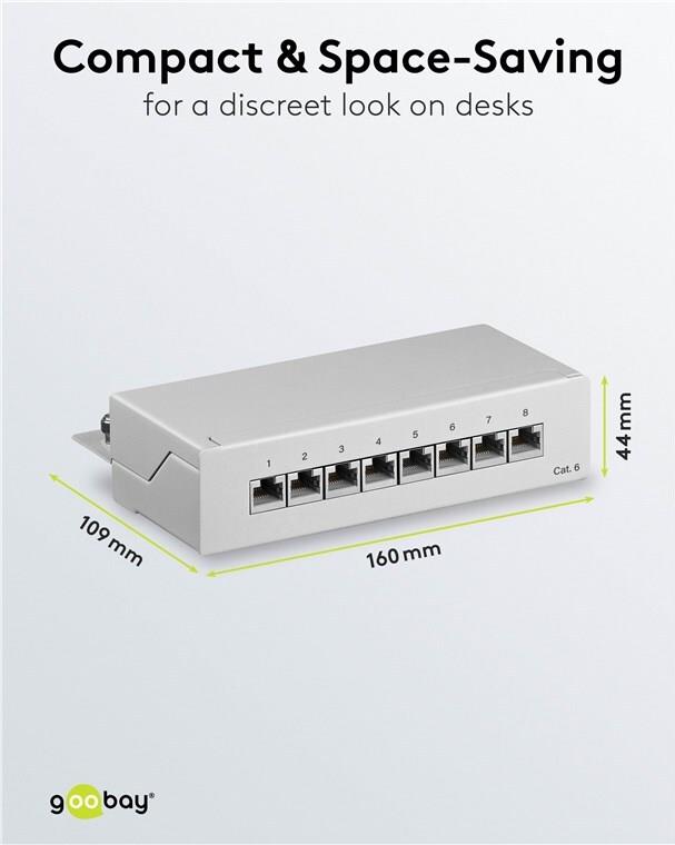 Wentronic Goobay CAT 6 Mini/Desktop Patch Panel, 8 Port, Grau - STP geschirmt, Grau (93047)