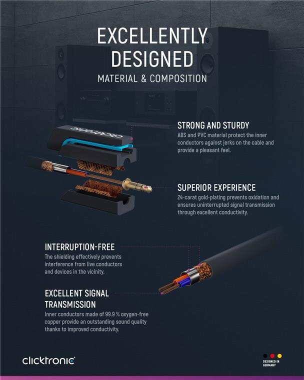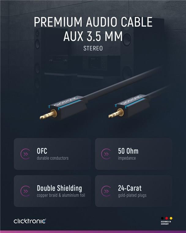 Das 3,5 mm Klinken-Kabel stellt die praktischste Möglichkeit zum Anschluss portabler Audio-Geräte an eine HiFi-Anlage, mobile Lautsprecher oder das Autoradio dar. Dank mehrfacher Signalschirmung, reiner Materialien und präziser Verarbeitung ist die 3,5 mm Audioverbindung im Handumdrehen hergestellt.