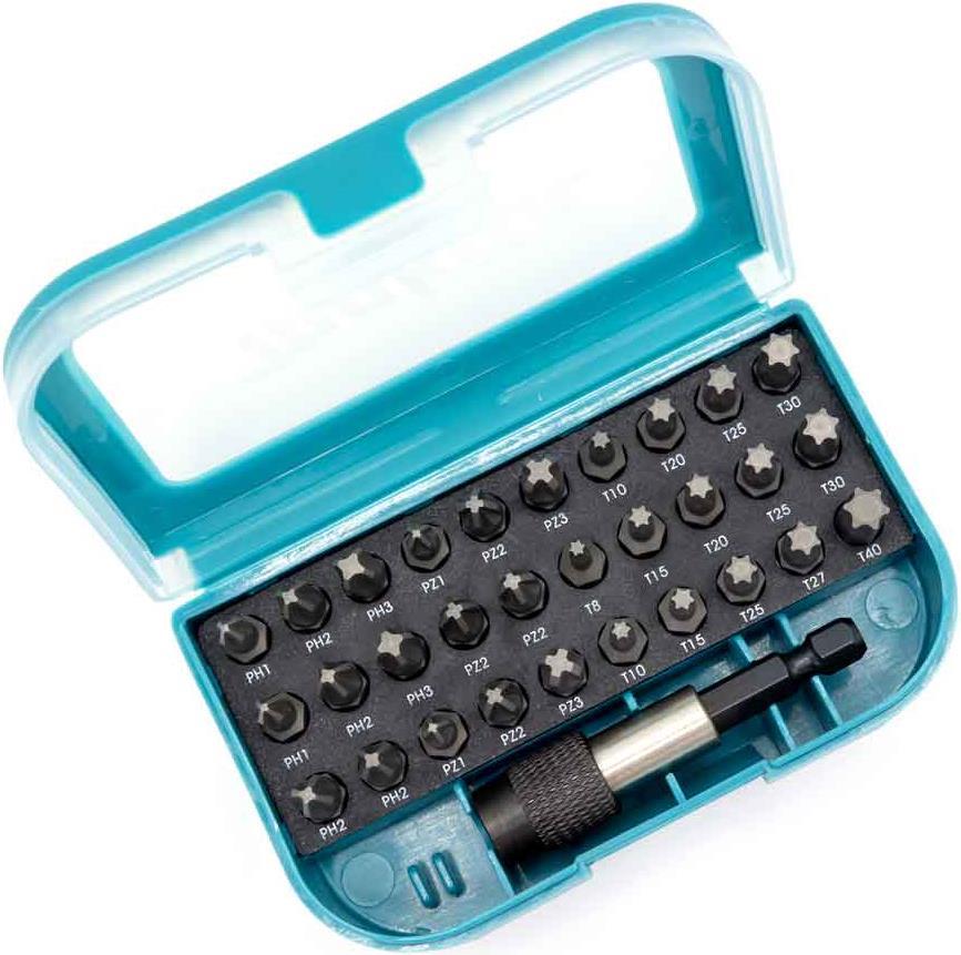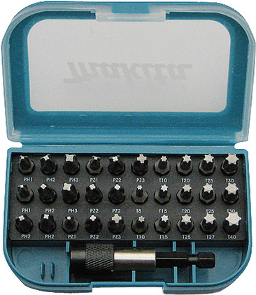 | Set-Details | 2 x Schraubendreher-Bit - PH1 4 x Schraubendreher-Bit - PH2 2 x Schraubendreher-Bit - PH3 2 x Schraubendreher-Bit - PZ1 4 x Schraubendreher-Bit - PZ2 2 x Schraubendreher-Bit - PZ3 1 x Schraubendreher-Bit - T8 2 x Schraubendreher-Bit - T10 2 x Schraubendreher-Bit - T15 2 x Schraubendreher-Bit - T20 3 x Schraubendreher-Bit - T25 1 x Schraubendreher-Bit - T27 2 x Schraubendreher-Bit - T30 1 x Schraubendreher-Bit - T40 1 x magnetic bit holder - Länge: 60 mm |