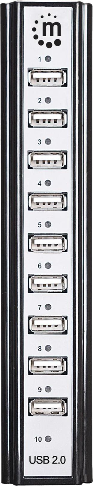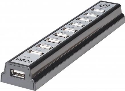 Dieser Manhattan Hi-Speed USB 2.0 Desktop Hub erweitert PCs und Notebooks um 10 abwärtskompatible USB-2.0-Ports und deckt damit den hohen Bedarf an USB-Ports heutiger computeraffiner Nutzer: Sei es zur Aufladung von Handys oder zum Anschluss von Tastatur, Maus, Webcam, Flash-Laufwerken, Card Readern und mehr. Das kompakte, robuste Kunststoffgehäuse bringt alle Anschlüsse seitlich statt auf der Oberseite unter und reduziert so das Kabelgewirr deutlich. Plug&Play, Hot-Swap-Fähigkeit, Windows- und Mac-Kompatibilität sowie Übertragungsgeschwindigkeiten bis zu 480 Mbit/s runden diese umfangreiche USB-Lösung ab.
