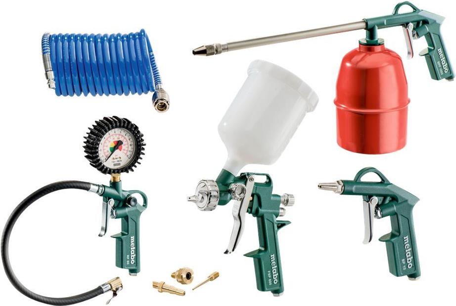 Druckluft-Werkzeugset LPZ 7 SetLieferumfang: BlaspistoleReifenfüllerFarbspritzpistoleSprühpistoleReifenfüllnippel und BallhohlnadelSpiralschlauch Rilsan.