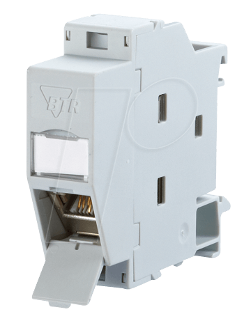 BTR REGplus IP20 E-DAT ModulAnschlusseinheit zur Montage auf Tragschiene TH35 nach DIN EN 60715 in Elektroverteilern für Haus- und IndustrieinstallationBestückt mit einem E-DAT modul RJ45 EinzelmodulKabelzugang 45° von oben, Steckrichtung 45° nach unten geneigtAusstattung: GHMT Cat.6 de-embedded PVP zertifiziertEinhaltung der Klasse EA nach ISO/IEC 11801 Ed.2.2:2011-06, DIN EN 50173-1:2011-09Getestet: Link bis 500 MHzFür 10 GBit Ethernet (IEEE 802.3an)Geeignet für Power over Ethernet (PoE, PoE plus und UPoE)Montagefreundlicher Anschluss der 2- bis 4-paarigen Datenleitung AWG 24/1 - 22/1 und Litzenleiter mit 7-drähtiger Cu-Litze AWG 26/7 an BTR 8fach IDC-SchneidklemmenKennzeichnung der Adernbelegung T568A oder T568BLeichtes und schnelles Einlegen der Adernpaare in das E-DAT modul LadestückDie Baubreite von 1TE ermöglicht den Einbau von bis zu 12 REGplus in Standard-ElektroverteilerBei Einbau als Gerät der Schutzklasse I erfolgt der Potentialausgleich über eine integrierte Potentialausgleichsblech direkt über die Hutschiene, welche über entsprechende Kontaktierungsklemmen am Gebäudepotentialausgleich anzuschließen istDas Modul ist durch eine Abdeckung vor direkter Berührung geschützt. Bei Montage in schutzisolierten Technische Daten: Ausführung (Netzwerkdosen): EinsatzFarbe: GrauInhalt: 1 St.Kabel-Zuführung: rückwärtigMontageart: HutschieneNetzwerk-Spezifikation: CAT 6ANetzwerkdosen-Besonderheiten: KompaktNetzwerkgeräte-Art (Kategorisierung): NetzwerkdoseSchnittstellen: LAN: 1 x
