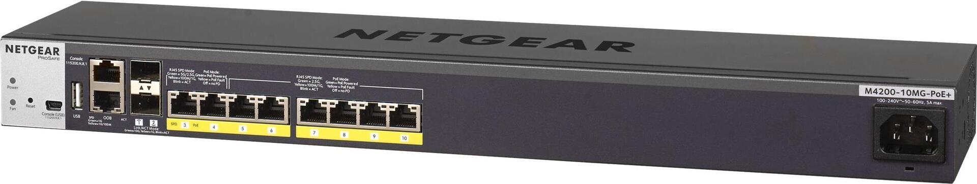 ProSAFE M4200-10MG-PoE+ ist ein weltweit bekannter Multigigabit-Ethernet-Switch mit acht Full Power PoE+ und multi-speed 1G/2,5G Ports kombiniert mit 10G Uplinks und für Fully-Non-Blocking-Bereitstellung von acht Wave 2 11ac Access Points jedes beliebigen Herstellers.