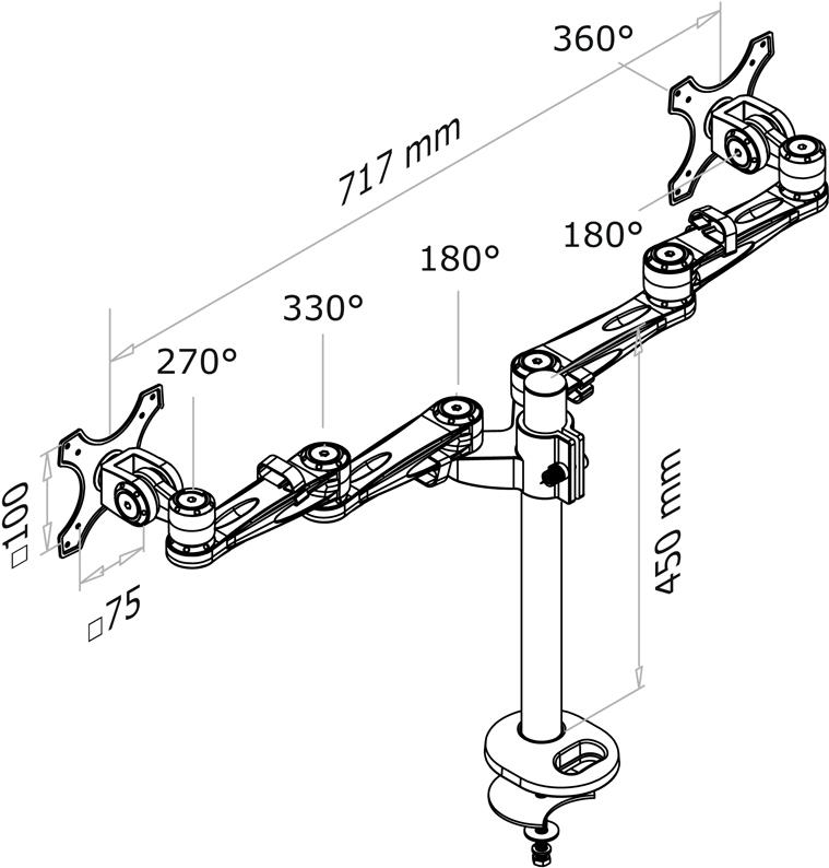 Die Neomounts Tischhalterung, das Modell FPMA-D935DG, ist eine neig-, schwenk- und drehbare Tischhalterung für zwei Flachbildschirme bis 27\" (69 cm). Diese Halterung ist eine gute Wahl für platzsparende Platzierung auf Schreibtischen mit einer Tischplattenbohrung. Neomounts neig- (180°), dreh- (360°) und schwenkbare (300°) Technologie ermöglicht es, die Halterung auf jedem Betrachtungswinkel zu ändern, um von dem vollen Umfang der Möglichkeiten des Flachbildschirms, zu profitieren. Die Halterung ist manuell höhenverstellbar von 0 bis 50 Zentimetern und Tiefen einstellbar von 12 bis 50 Zentimetern. Eine einzigartige Kabelführung verdeckt und führt Kabel von der Halterung zum Flachbildschirm. Verstecken Sie Ihre Kabel, um den Arbeitsplatz schön und ordentlich zu halten.Durch eine ergonomische Halterung können Nacken- und Rückenbeschwerden vermieden werden. Ideal für den Einsatz in Büros und auf Theken oder in einem Empfangsbereich. Neomounts FPMA-D935DG hat drei Drehpunkten und eignet sich für Bildschirme bis 27\" (69 cm). Die Tragfähigkeit dieses Produkts ist für Bildschirme je 6 kg. Die Tischhalterung ist geeignet für Bildschirme mit VESA 75x75 oder 100x100 mm Lochmuster. Verschiedene andere Lochmuster können, unter Verwendung von Neomounts VESA Adapterplatten, abgedeckt werden.