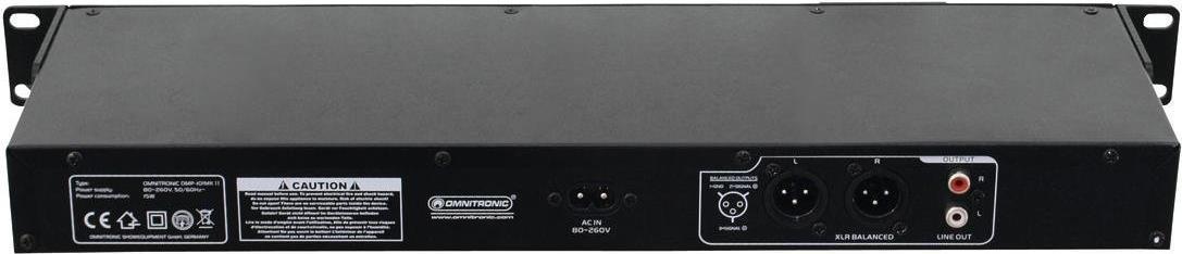 Omnitronic DMP-102 USB/SD-Card-PlayerMP3-Player für SD(HC)-/MMC-Speicherkarten und USB-Geräte, mit IR-Fernbedienung.Ausstattung: Wiedergabe von MP3-Dateien von SD(HC)-/MMC-Speicherkarten und USB-GerätenVolle Kompatibilität für CBR- und VBR-DateienUnempfindlich gegen ErschütterungenOrdnernavigationPitchregelung ±16 %, deaktivierbarPitch-Bend-FunktionCue-FunktionNahtlose Loop-/Reloop-FunktionEinzel- oder GesamttitelwiedergabeZufallswiedergabeWiederholfunktionen Repeat 1, Repeat AllAlphanumerisches LC-Display (blau hinterleuchtet)Anzeige von Interpret, Titelname und OrdnernameAnzeige von Titelrestspielzeit oder TitelabspielzeitAnzeige der Geschwindigkeitsänderung in %Search-Tasten für schnelles Vor- und Zurückbewegen im TitelFarbig beleuchtete Gummitasten mit extra großer Play/Pause- und Cue-TasteRegelbarer Mikrofoneingang (XLR, sym.) auf der FrontplatteRegelbarer Kopfhörerausgang (3,5-mm-Klinke) auf der FrontplatteRegelbarer Master-Ausgang (3-pol. XLR und Cinch)Inkl. Montagewinkeln für 483-mm-Rackeinbau (1 HE)Ideal für Festinstallationen, wo der schnelle und leichte Zugriff auf Musik benötigt wird (z. B. Restaurants, Fitnessstudios, Einzelhandel, usw.)Technische Daten: Anti-Shock: JaDJ Equipment-Typ (Kategorisierung): DJ Einzel Media Player 19 ZollEffektsektion: NeinGewicht: 2.4 kgMP3 Wiedergabe: JaPitchbereich: ±16 %Produktabmessung, Breite: 483 mmProduktabmessung, Höhe: 44 mmProduktabmessung, Tiefe: 170 mmSchnittstellen (Sound & Light): Cinch-Ausgang, XLR-Ausgang, USB-Typ ASchnittstellen: USB: 1 xScratch-Funktion: NeinWeitere technische Daten: Spannungsversorgung: 80-260 V AC, 50/60 Hz ~Gesamtanschlusswert: 15 WTyp: MP3-PlayerGeeignete Datenträger: SD(HC)-, MMC-Speicherkarten und USB-GeräteQuantisierung: 24-Bit-D/A-WandlerSamplingfrequenz: 44,1 kHzGeschwindigkeitsanpassung: ±16 %Display: Interpret, Titelname, Ordnername, Titelrestspielzeit und TitelabspielzeitKlirrfaktor: 0,03 %Geräuschspannungsabstand: -96 dBFrequenzgang: 20-20000 HzMikrofoneingang: 3-pol. XLR, sym.Kopfhöreranschluss: 3,5 mm StereoklinkeAudioausgang: Stereo-Cinch, unsym.,Stereo-XLR (3-pol), sym.Fernbedienung: 2 x 1,5-V-Microbatterie (Typ AAA)Maße: 483 x 48 x 170 mmRackeinbau, 1 HEGewicht: 2,3 kgLieferumfang: IR-Fernbedienung.