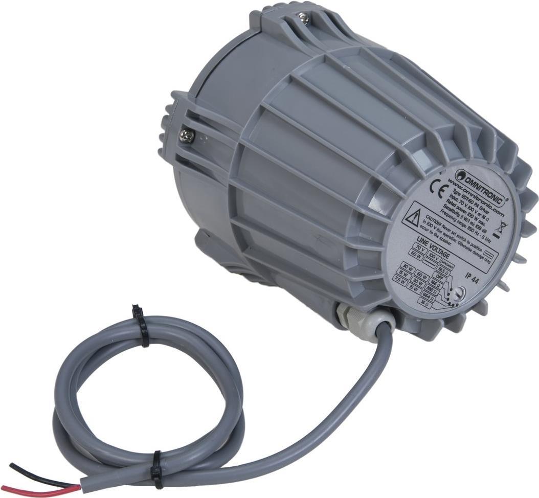 Omnitronic ED-60T Druckkammer-TreiberDruckkammer-TreiberDruckkammer-Treiber60-W-Druckkammer-Treiber passend für Hörner EH-310, EH-400 und EH-560Geeignet für den Betrieb mit 70 V, 100 V oder 16 OhmLeistungsumschalter35-mm-Flanschgewinde (3,5 cm/1 3/8\"\")Spritzwassergeschützte Konstruktion (IP 44) für den AußeneinsatzTechnische Daten: Belastbarkeit (max.): 60 WBelastbarkeit RMS: 8 WFarbe: WeißFrequenzbereich: 350 - 5000 HzGewicht: 3.0 kgLautsprecher-Besonderheiten: spritzwassergeschütztLautsprecherart (Kategorisierung): DruckkammertreiberProduktabmessung, Länge: 215 mmProduktabmessung, Ø: 130 mmSchalldruck (max.): 108 dBSchutzart: IP44Weitere technische Daten: Anschluss: 70 V, 100 V oder 16 OhmNennleistung: 60/30/15/7,5 W RMSEmpfindlichkeit (1 W, 1 m): 108 dBFrequenzbereich: 350 Hz - 5 kHzSchallaustrittsöffnung: 2,5 cm (1)Gewindedurchmesser: 35 mmSchutzart: IP 44Maße (DxH): 122 x 173 mmGewicht: 3 kg\"\"