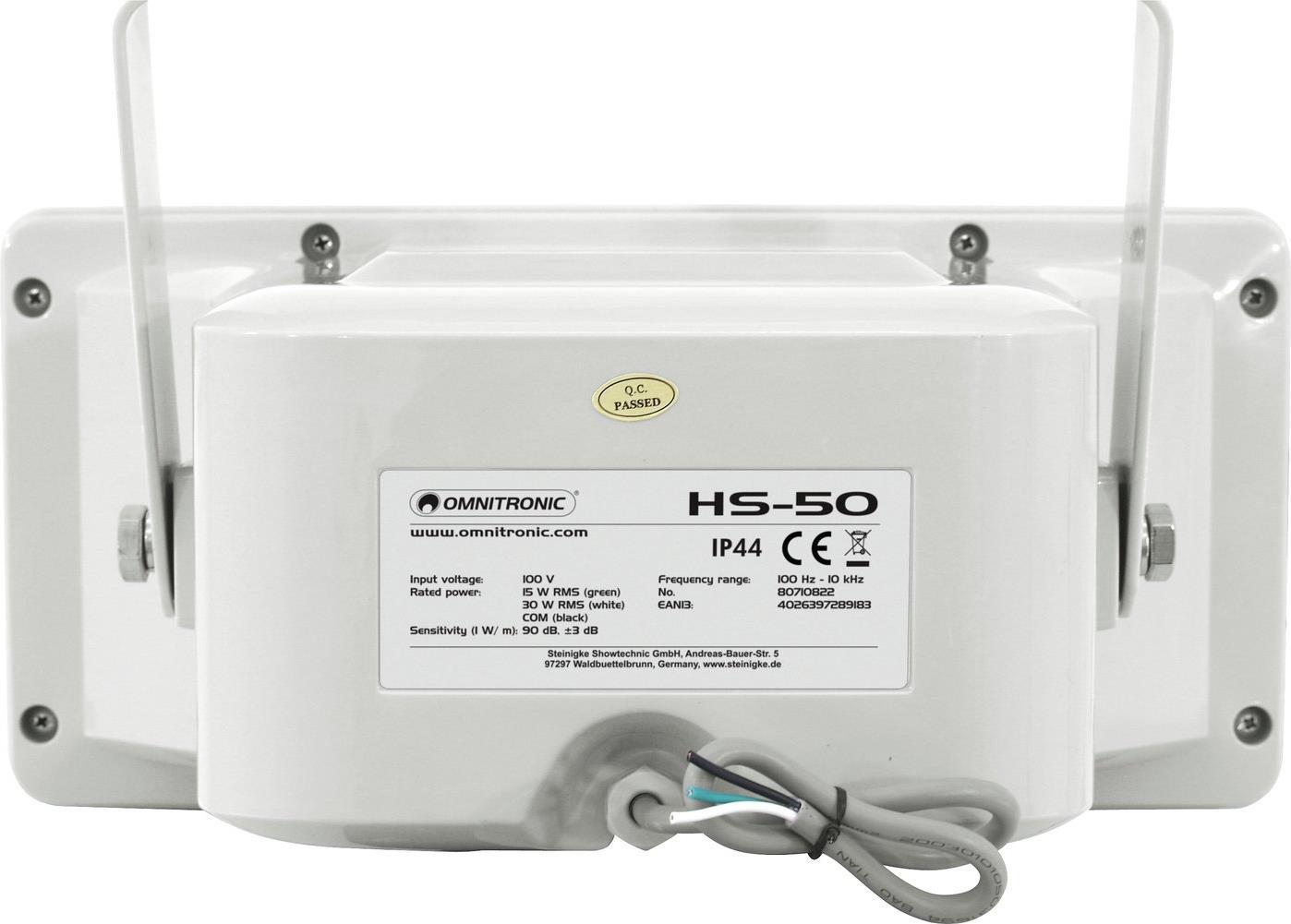 Omnitronic HS-50 Druckkammer-Lautsprecher100 V TechnikWetterfestFür Beschallungsanlagen im Außenbereich wie z. B. Sportplätze, Schwimmbäder, Open Air-Veranstaltungen.Ausstattung: Schalldruck 105 dB12 cm (5\"\")-Konuslautsprecher für ausgewogenen Klang.Technische Daten: Belastbarkeit (max.): 30 WBelastbarkeit RMS: 15 WBetriebsspannung (num): 100 VFarbe: WeißFrequenzbereich: 100 - 10000 HzGewicht: 3 kgImpedanz: 8 ?Lautsprecher-Besonderheiten: spritzwassergeschütztLautsprecherart (Kategorisierung): ELA-DruckkammerlautsprecherMaterial (LOV): KunststoffProduktabmessung, Breite: 165 mmProduktabmessung, Höhe: 366 mmProduktabmessung, Länge: 272 mmSchalldruck (max.): 105 dBSchutzart: IP44