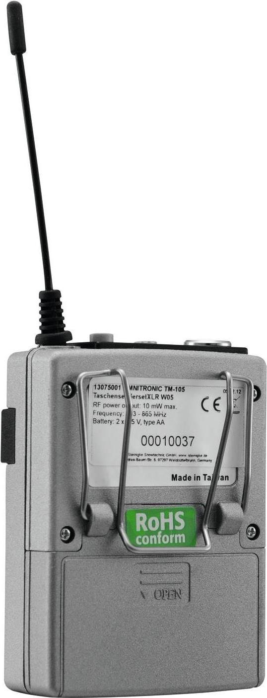 OMNITRONIC TM-105 Taschensenderset XLR WAMS-05Multifrequenz-Taschensender für W.A.M.S.-05Ausstattung: Multifrequenz-Taschensender für W.A.M.S.-05Set enthält Taschensender und KopfbügelmikrofonTaschensender mit UHF-PLL-Technik, passend für W.A.M.S.-05 SystemGeeignet für optional erhältliches Krawattenmikrofon LS-105Betrieb im störungsarmen UHF-Bereich (863,1-864,9 MHz) mit 16 schaltbaren FrequenzenLCD-Anzeige für Kanal, Frequenz und BatteriekapazitätEmpfindlichkeit 3-stufig regelbarSendeleistung 10 mWFür 2 x 1,5 V Mignon-Batterien oder 2 x 1,2 V Akkus (Typ AA) (nicht mitgeliefert)Mit Ladekontakten, geeignet für Ladestation TM-105Anschluss über Mini-XLR-SteckerAnmelde- und gebührenfrei in der EUTechnische Daten: Bauart (Mikrofone): HeadsetMikrofon-Typ (Kategorisierung): Sprach-MikrofonSchnittstellen (Computer/Multimedia): FunkÜbertragungsart: Funk
