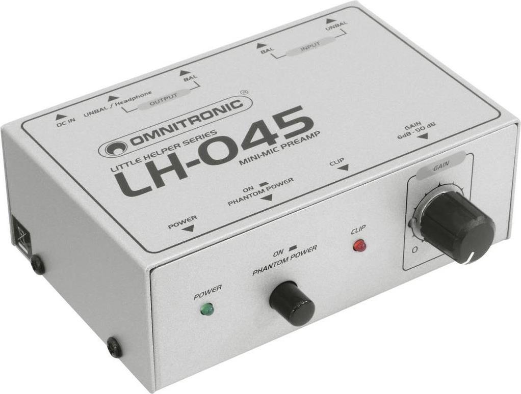 Omnitronic LH-045 Mikrofon-Vorverstärker1-Kanal-Mikrofon-Vorverstärker1-Kanal-Mikrofon-Vorverstärker1 Mikrofoneingang, XLR- (sym.) oder 6,3-mm-Klinkenbuchse (unsym.)Verstärkung stufenlos regelbar (6-50 dB)Phantomspeisung zuschaltbarClip-LED1 Line-Ausgang, XLR- (sym.) oder 6,3-mm-Klinkenbuchse (unsym.)Spannungsversorgung über mitgeliefertes NetzteilTechnische Daten: Gewicht: 0.7 kgProduktabmessung, Breite: 230 mmProduktabmessung, Höhe: 85 mmProduktabmessung, Tiefe: 135 mmWeitere technische Daten: Spannungsversorgung: 12 V DC, 150 mAEingangsimpedanz: 10 kOhm, sym./unsym.Max. Eingangspegel: +4 dB sym./+10 dB unsym.Gain: 50 dB XLR/44 dB KlinkeKlirrfaktor: 0,01 %Frequenzgang: 25 Hz - 16 kHzGeräuschspannungsabstand: >75 dBMaße: 143 x 93 x 45 mmGewicht: 350 g