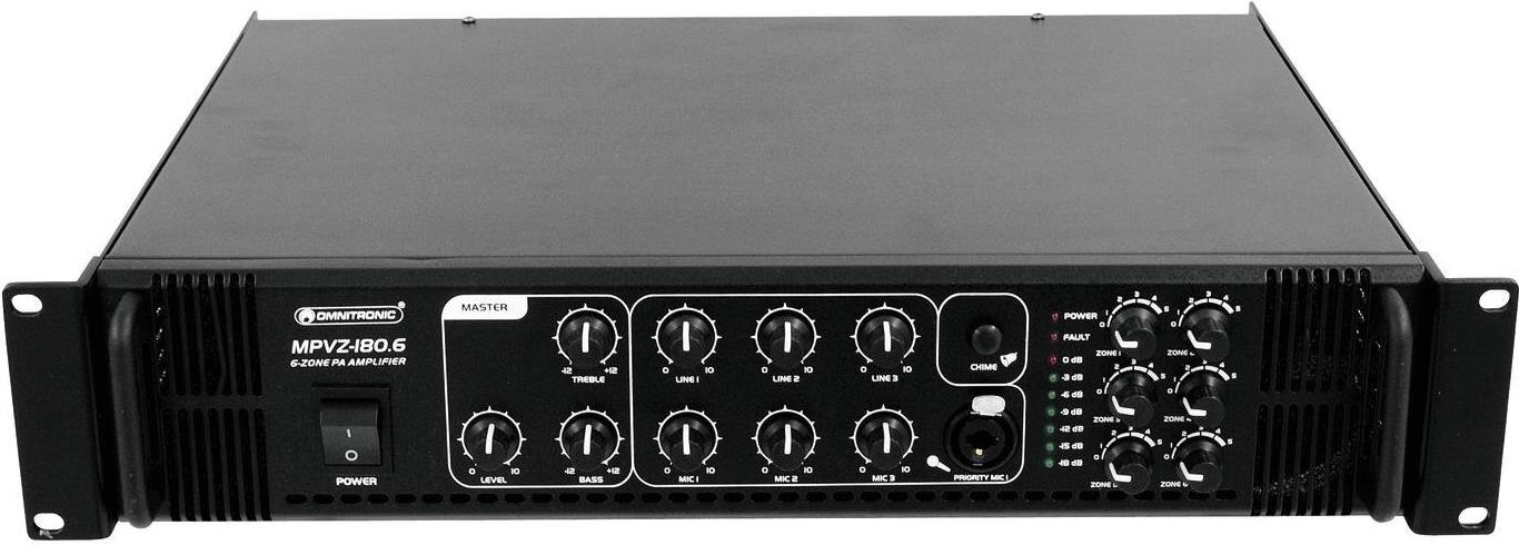 Omnitronic MPVZ-180.6 Mischverstärker6-Zonen-ELA-Mono-Mischverstärker6-Zonen-ELA-Mono-MischverstärkerKomfortable Ansteuerung für ELA-Lautsprecher über 6-Zonen-Technik6 ELA-Zonenausgänge (100 V) jeweils mit 5-stufigem LautstärkestellerMaster-ELA-Lautsprecherausgang (70 und 100 V)Anschlussmöglichkeit für niederohmige Lautsprecher (4-16 Ohm)2 rückseitige Mikrofon-Eingänge (6,3-mm-Klinke, unsym.)1 frontseitiger Mikrofon-Eingang (Kombination XLR/6,3-mm-Klinke, unsym.) auf der Frontplatte mit regelbarer PrioritätsfunktionAlle Mikrofon-Eingänge mit getrennten Lautstärkereglern3 Line-Eingänge (Stereo-Cinch) mit getrennten Lautstärkereglern1 Line-Ausgang (Stereo-Cinch)Gong, schaltbarHöhen- und Bass-Klangregler für Ausgangssignal7-fache LED-PegelanzeigeLüftergekühltSchutzschaltungen mit LED-Anzeige: Überspannung, Kurzschluss, EinschaltverzögerungRackeinbauTechnische Daten: Ausgangsleistung: 180 W RMSBetriebsspannung: 230 V AC/50 HzGewicht: 12.0 kgProduktabmessung, Breite: 550 mmProduktabmessung, Höhe: 180 mmWeitere technische Daten: Spannungsversorgung: 230 V AC, 50 HzGesamtanschlusswert: 360 WAusgangsleistung: 180 W RMSAusgangsart: 70 V, 100 V oder 4-16 OhmAusgangsstrom: 2,5 A (70 V), 1,8 A (100 V)Mikrofoneingänge: 5 mV, 600 OhmLine-Eingänge: 300 mV, 10 kOhmLautsprecherausgänge: Schraubklemme, KlemmleisteFrequenzgang: 80 Hz - 16 kHzVerzerrung: 0,5 % (1 kHz)Geräuschspannungsabstand: 85 dB (Line), 75 dB (Mic)Maße: 483 x 385 x 92 mmGewicht: 12 kg