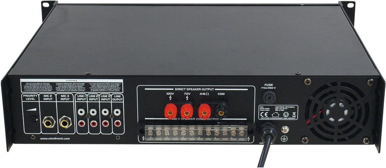 Omnitronic MPVZ-350.6 Mischverstärker6-Zonen-ELA-Mono-Mischverstärker6-Zonen-ELA-Mono-MischverstärkerKomfortable Ansteuerung für ELA-Lautsprecher über 6-Zonen-Technik6 ELA-Zonenausgänge (100 V) jeweils mit 5-stufigem LautstärkestellerMaster-ELA-Lautsprecherausgang (70 und 100 V)Anschlussmöglichkeit für niederohmige Lautsprecher (4-16 Ohm)2 rückseitige Mikrofon-Eingänge (6,3-mm-Klinke, unsym.)1 frontseitiger Mikrofon-Eingang (Kombination XLR/6,3-mm-Klinke, unsym.) auf der Frontplatte mit regelbarer PrioritätsfunktionAlle Mikrofon-Eingänge mit getrennten Lautstärkereglern3 Line-Eingänge (Stereo-Cinch) mit getrennten Lautstärkereglern1 Line-Ausgang (Stereo-Cinch)Gong, schaltbarHöhen- und Bass-Klangregler für Ausgangssignal7-fache LED-PegelanzeigeLüftergekühltSchutzschaltungen mit LED-Anzeige: Überspannung, Kurzschluss, EinschaltverzögerungRackeinbauTechnische Daten: Ausgangsleistung: 350 W RMSBetriebsspannung: 230 V AC/50 HzGewicht: 15.9 kgProduktabmessung, Breite: 550 mmProduktabmessung, Höhe: 180 mmWeitere technische Daten: Spannungsversorgung: 230 V AC, 50 HzGesamtanschlusswert: 700 WAusgangsleistung: 350 W RMSAusgangsart: 70 V, 100 V oder 4-16 OhmAusgangsstrom: 5 A (70 V), 3,5 A (100 V)Mikrofoneingänge: 5 mV, 600 OhmLine-Eingänge: 300 mV, 10 kOhmLautsprecherausgänge: Schraubklemme, KlemmleisteFrequenzgang: 80 Hz - 16 kHzVerzerrung: 0,5 % (1 kHz)Geräuschspannungsabstand: 85 dB (Line), 75 dB (Mic)Maße: 483 x 385 x 92 mmGewicht: 16 kg
